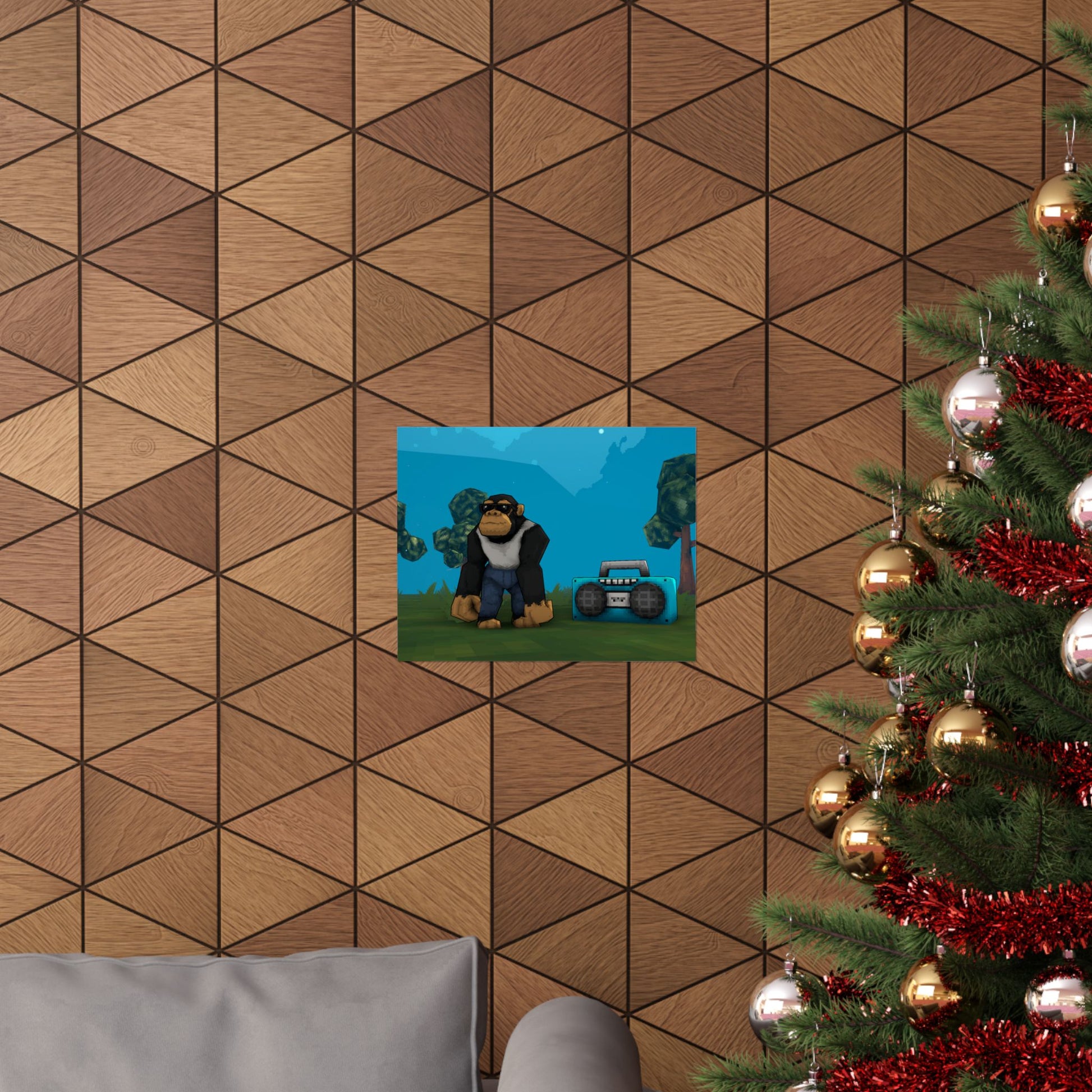 A matte horizontal poster that brings playful character and vivid color into any room. Printed on museum-grade archival paper with giclée inks, the scene stays bright and true over time while the light-absorbing matte finish reduces glare. The artwork — a relaxed gorilla beside a retro boombox in a stylized outdoor setting — feels whimsical and nostalgic. Hung above a desk, bed, or game setup, this poster adds a touch of charm and story without shouting. Available in many sizes to fit gallery walls or cozy corners; intended for indoor display and crafted to keep its tones rich for years.